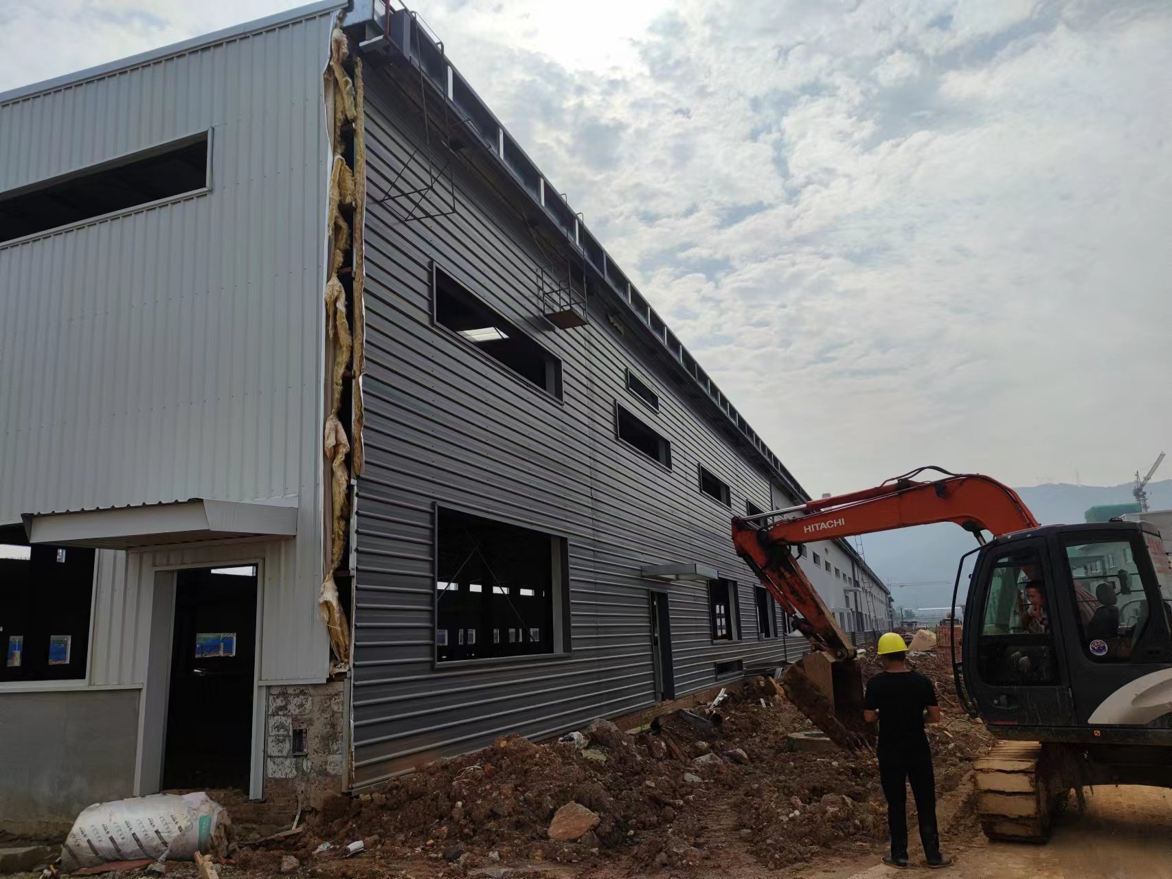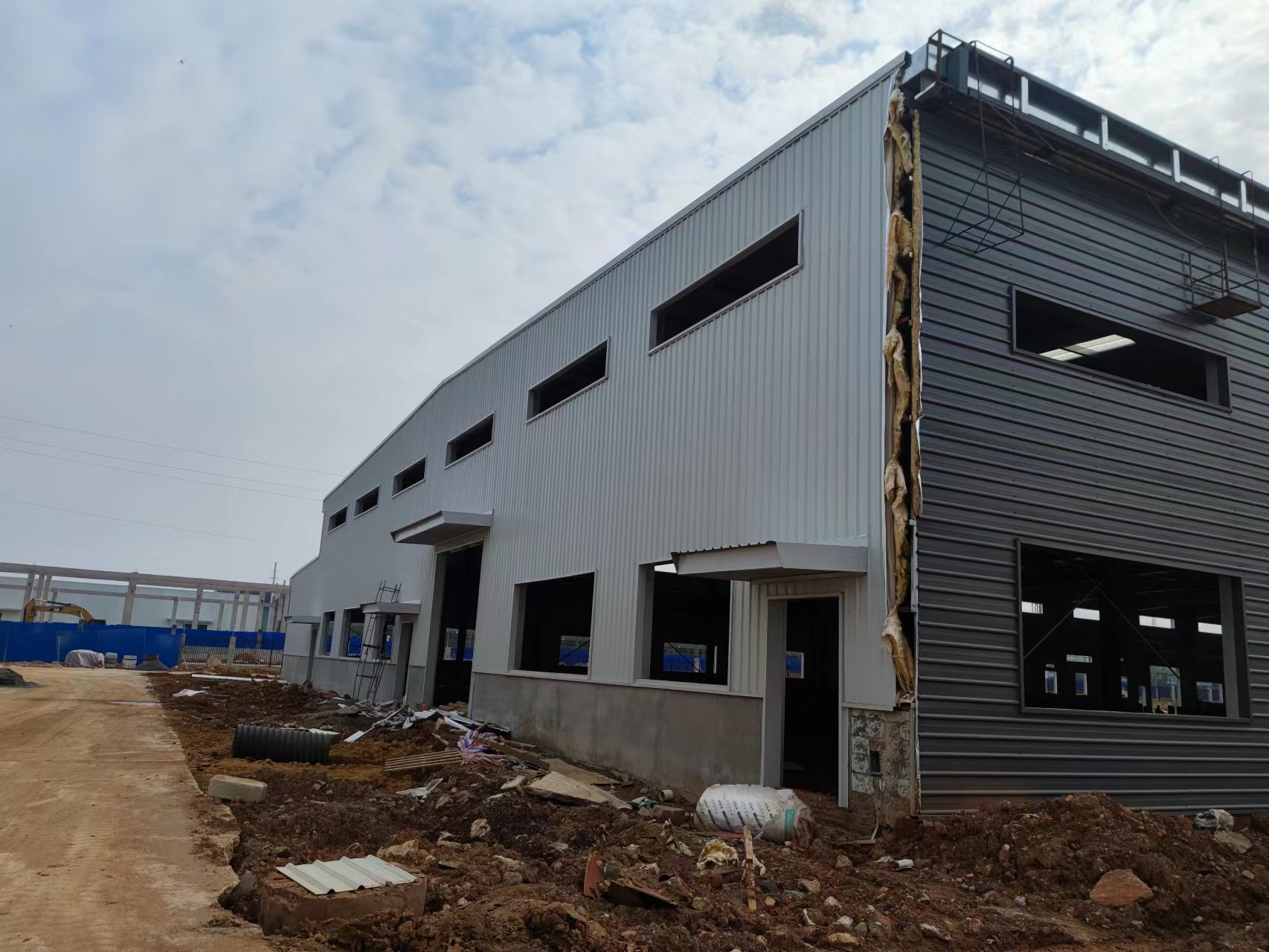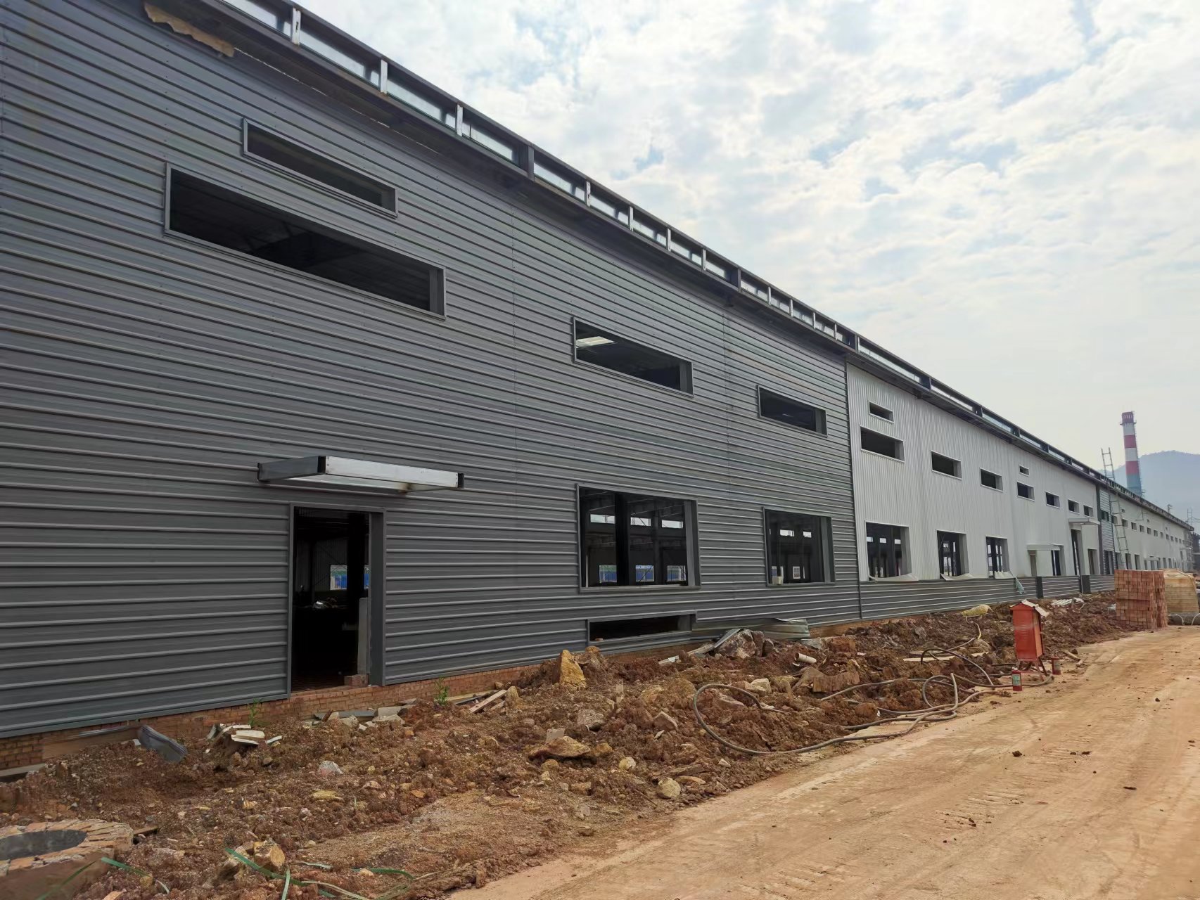 由我公司承包施工的湖南光電新材料產(chǎn)業(yè)園項(xiàng)目2#廠(chǎng)房現(xiàn)已完成1-39軸的梁柱吊裝工作,1-27軸屋面板、墻面板已安裝完成。