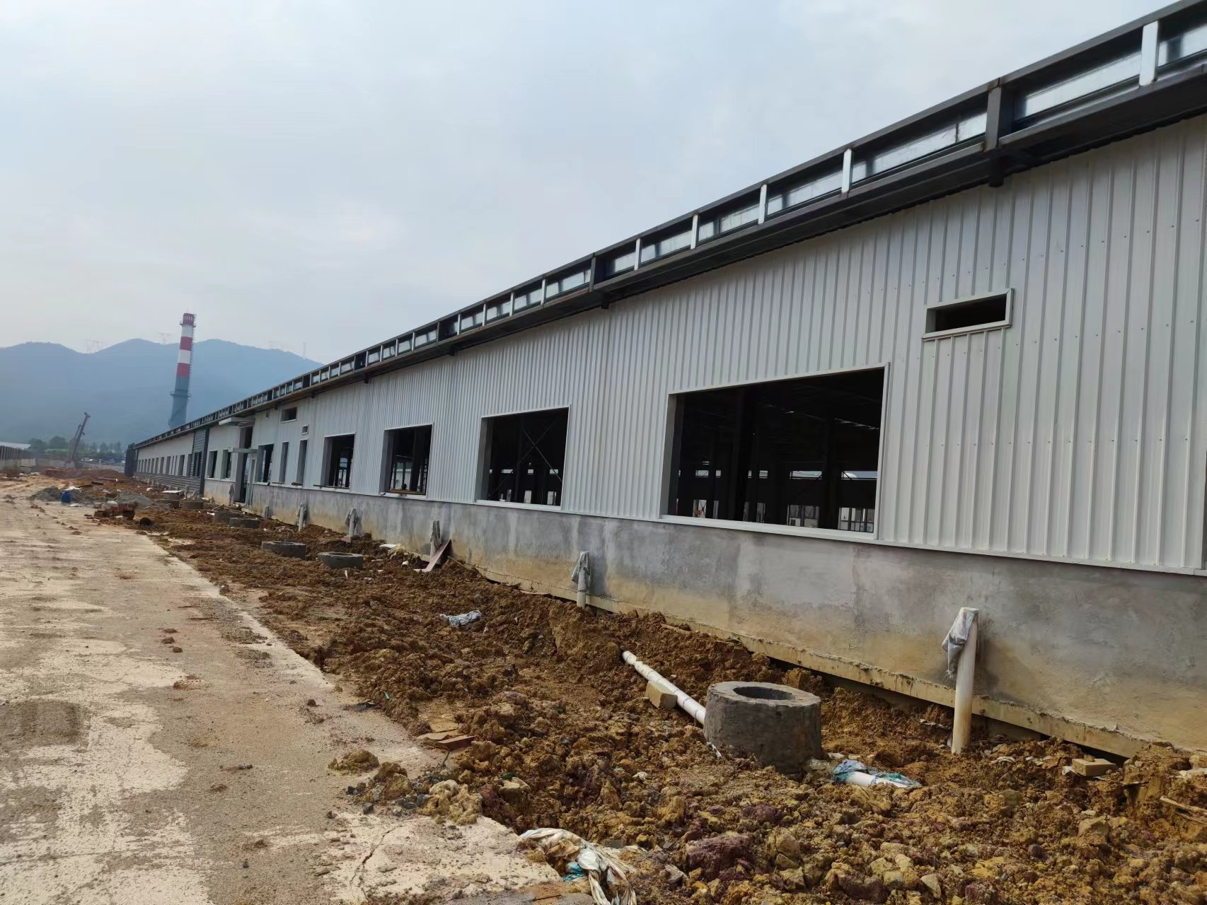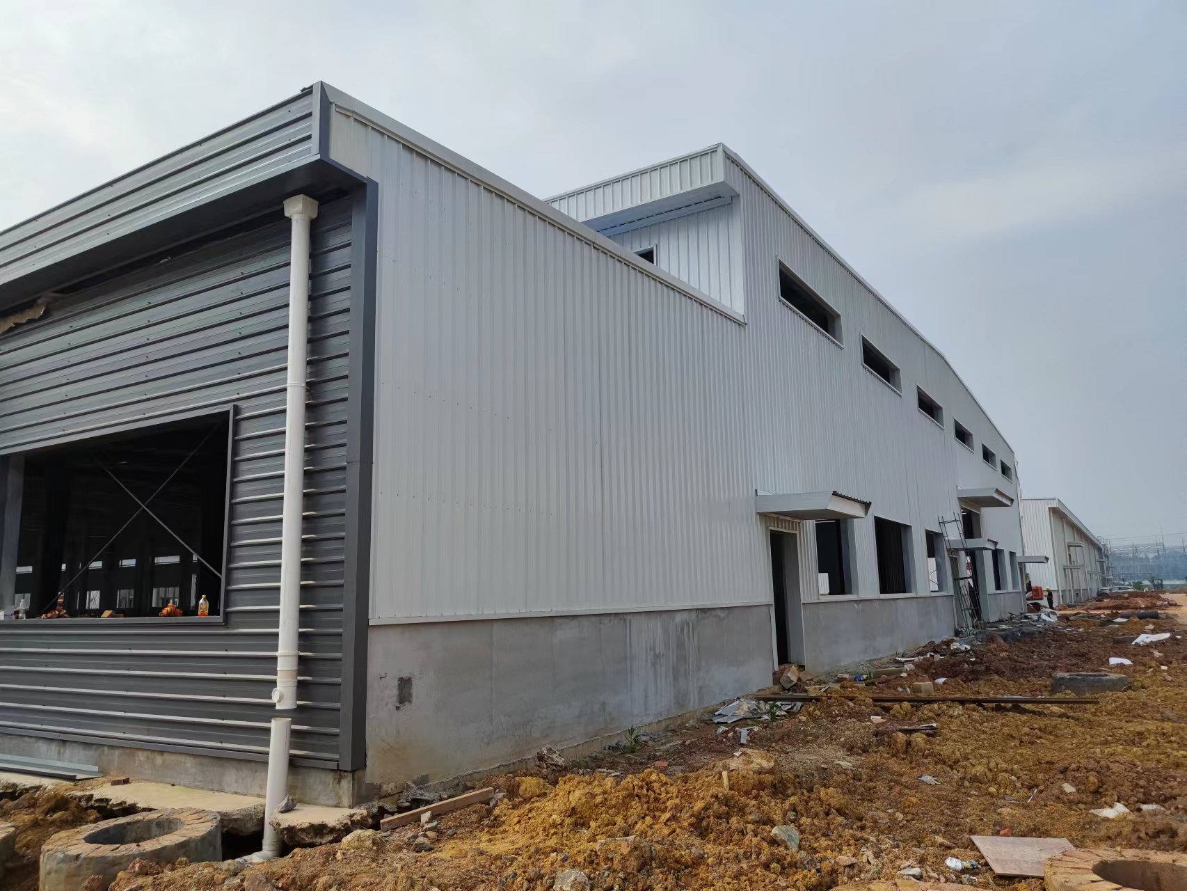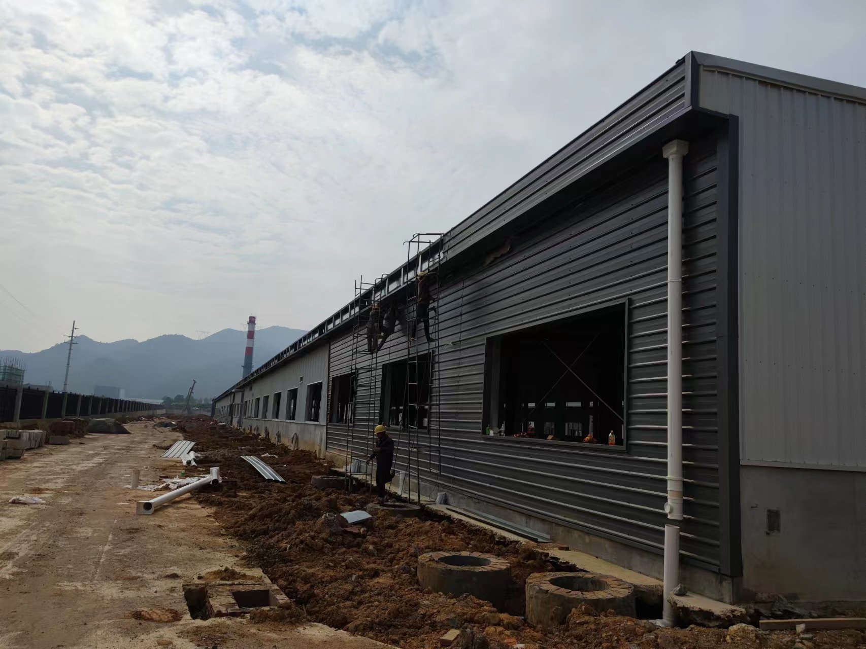 由我公司承包施工的湖南光電新材料產(chǎn)業(yè)園項(xiàng)目2#廠(chǎng)房現(xiàn)已完成1-39軸的梁柱吊裝工作,1-27軸屋面板、墻面板已安裝完成。
