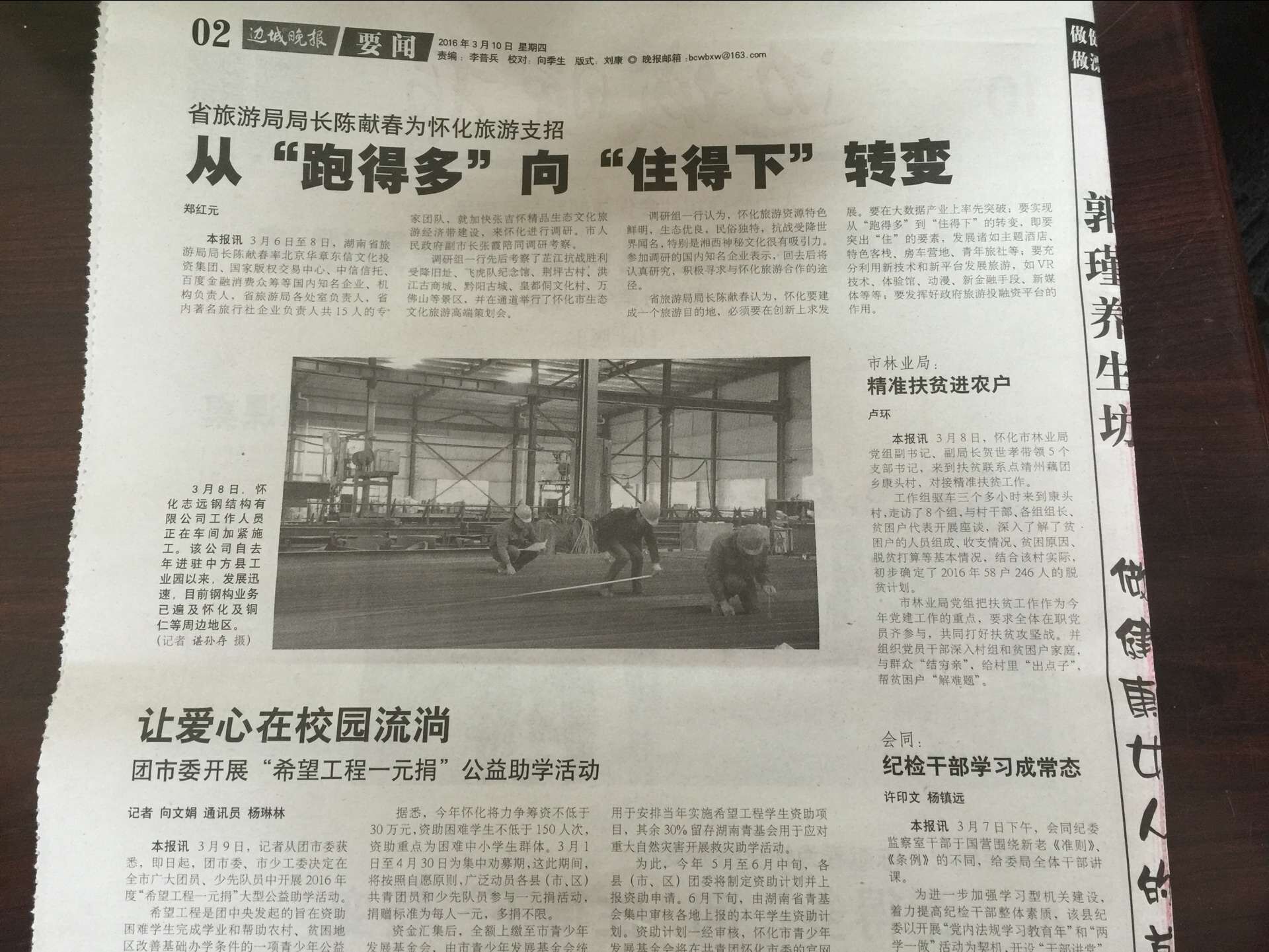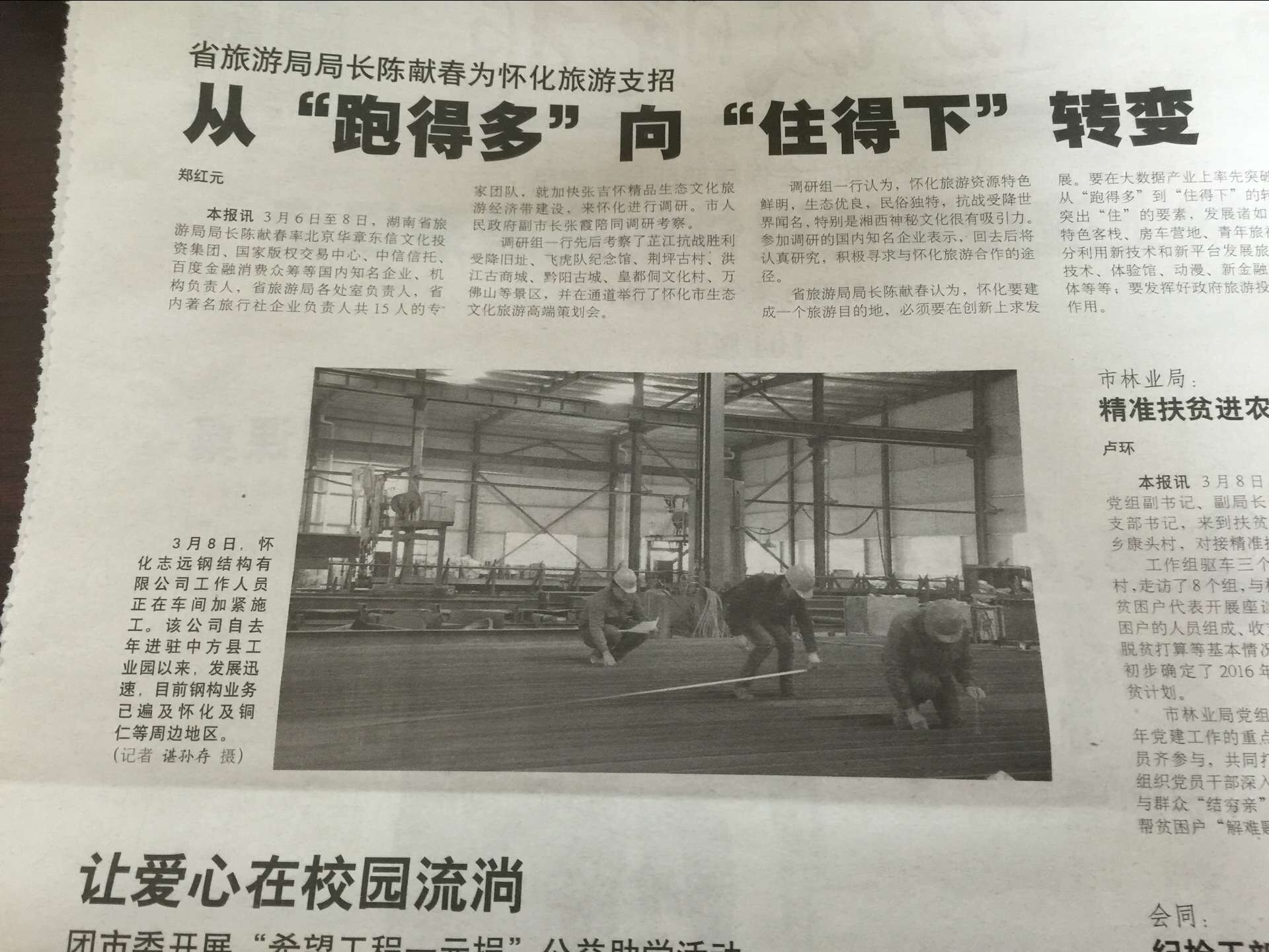 近日,懷化市《邊城晚報》記者一行三人對懷化志遠(yuǎn)鋼結(jié)構(gòu)工程有限公司進(jìn)行采訪。主要圍繞公司的生產(chǎn)工藝、業(yè)務(wù)能力、市場開拓、管理制度進(jìn)行了深入了解,并對我公司的技術(shù)研發(fā)水平產(chǎn)生豎起“大拇指”,認(rèn)為我公司的技術(shù)水平、生產(chǎn)能力和產(chǎn)品質(zhì)量在懷化及周邊地區(qū)排名靠前,相信憑著公司全體員工的辛苦工作、誠信經(jīng)營,志遠(yuǎn)鋼構(gòu)會越做越好、越做越強!